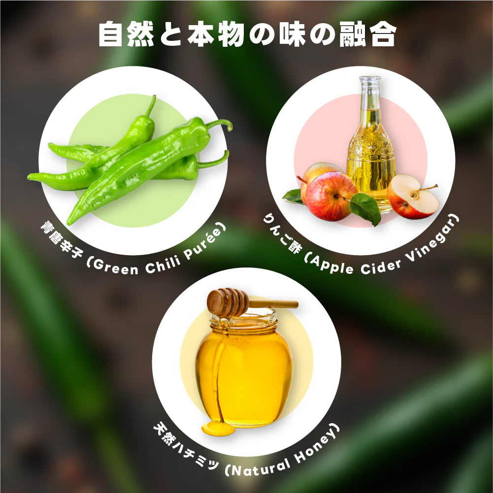 材料:蘋果醋(日本製造)、青辣椒泥、Shikuwasa 果汁(沖繩製造)、蜂蜜、蒜粉、食用調和油/穩定劑(黃原膠)、(含蘋果)
